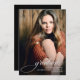 Este anúncio de graduação de na moda de tendência apresenta belos textos de roteiro que soletra a palavra graduação com um modelo de texto para personalizar com o nome, a escola e o ano de graduação. Carregue a foto vertical desejada no lugar da foto de amostra mostrada no modelo de design. O verso deste anúncio foi intencionalmente deixado em vazio. Você pode personalizar ainda mais adicionando texto adicional na parte traseira do cartão, se desejar.
