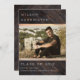 Anúncio de graduação em madeira escura com texto branco impresso. Adicione a foto do filho à parte central desta placa plana. Seu nome é impresso em letras grandes no topo com "Classe de [ano]" abaixo. Inclua também o nome de seu segundo grau (ou faculdade) e onde ele frequentará a escola no outono.