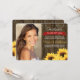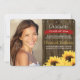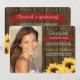 Adicione sua foto favorita da classe de mais velho a estes anúncios de fotos e convites de formatura de girassol com um charme de vintage country. Os girassóis ouros pardos bordeiam este novo formando convite com uma cerca de madeira marrom, com um fundo de cerca de unha, que lembra um casarão velho, uma fazenda ou um barril. Adicione o ano de sua classe graduada à design de aparência do banner de fita impresso de hued vermelho. A cerimônia de graduação e os detalhes do festejo podem ser adicionados ao verso deste convite. Design © Chrissy H. Estúdios, LLC. Todos os direitos reservados.