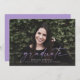 Este anúncio de graduação de fotos sangradas do cheio apresenta a palavra "formando" escrita em roxo na frente. Tem espaço para o nome do formando, ano de aula e escola. A parte traseira do cartão pode ser usada para uma mensagem pessoal ou para os detalhes do convite de festa de formatura.