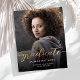 Anúncio de graduação moderno com uma foto vertical personalizada. A palavra "formando" aparece em uma escrita em folha de alumínio dourada com traços decorativos no início e no fim. Adicione o nome do formando, a escola e o ano de graduação abaixo em fontes brancas sans serif. Substitua facilmente a imagem de amostra pela foto do seu próprio formando. Uma tela de gradiente preto ajuda a garantir que o texto seja pop. O reverso é preto sólido. Ideal para segundo grau ou formandos.