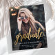 Anúncio de graduação moderno com uma foto vertical personalizada. A palavra "formando" aparece em um script de folha falsa em ouro, com o nome do formando, a escola e o ano de graduação abaixo em fontes brancas sans serif. Substitua facilmente a imagem de amostra pela foto do seu próprio formando. Uma tela de gradiente preto ajuda a garantir que o texto seja pop. O reverso é preto sólido. Ideal para segundo grau ou formandos.