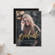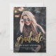Anúncio de graduação moderno com uma foto vertical personalizada. A palavra "formando" aparece em um script de folha falsa em ouro, com o nome do formando, a escola e o ano de graduação abaixo em fontes brancas sans serif. Substitua facilmente a imagem de amostra pela foto do seu próprio formando. Uma tela de gradiente preto ajuda a garantir que o texto seja pop. O reverso é preto sólido. Ideal para segundo grau ou formandos.
