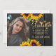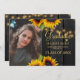 Cartão de anúncio de graduação elegante floral com buquês de girassóis, cordas de luzes brilhantes e um falso roteiro de tipografia quic em ouro sobre um fundo de madeira marrom-escura.++++++ Fácil de personalizar com seu nome, escola e classe.