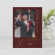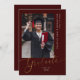 Cartão de anúncio de graduação moderno com fundo vermelho farrado com texto branco e sua foto. O texto do script na falso brilho dourado diz "formando" na parte inferior.
