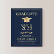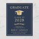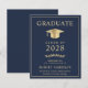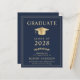 Elegante e econômico anúncio de graduação universitária azul escuro com um chapéu de graduação dourado e tipografia moderna simples dourada clara para o nome do graduado, ano de turma, faculdade ou universidade, grau e curso ou honrarias.