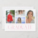 O Cartão de Anúncio de Graduação Múltipla de Fotos com Script Simples apresenta quatro das suas fotos favoritas da sua faculdade ou formando de segundo grau na frente com a elegante camada de "Formando" do roteiro de caligrafia rosa. Adicione uma foto adicional no verso. Simples, na moda e elegante. Criado por ©Evco Studio www.zazzle.com/store/evcostudio