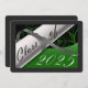 Cartão verde e prateado com diploma e ano de graduação. O verso é uma cinza com letras brancas para os anúncios de graduação.