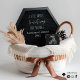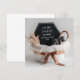 uma bela cesta tecida branca estilizada adornada com uma fita marrom suave. Aninhado dentro está um charmoso quadro de letras hexagonal preto perfeito para personalizar as notícias do seu bebê ao lado de grama de pampas natural e um pequeno e fofo bolota para um toque rústico inspirado na floresta. ideal para fotos de revelação de gênero, anúncios de gravidez nas redes sociais, convites para chá de bebê, lembrança e cartões de revelação de gravidez.