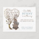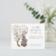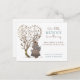 A floresta gira e engraçada ilustrada no anúncio da gravidez, postcard mostra um coelho ao lado de uma doce árvore, com uma copia em forma de coração. Anúncio de cartão postal de gravidez em azul pastel e castanho.