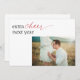 Mais alegria, ano que vem. Um cartão postal de anúncio de gravidez de férias para surpreender sua família e amigos. Apresentando uma fonte vermelha de caligrafia para dar mais ênfase ao novo pacote de alegria que está entrando em suas vidas. Cartão postal de fotos moderno, mas simples, para compartilhar a chegada do bebê.