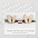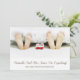 Foto moderna e bonita dos pés dos pais e meias de bebês debaixo de cobrir de cama com pegadas de bebês no verso do anúncio e seus nomes no roteiro. Adicione seus nomes e o mês estimado de chegada do bebê.