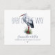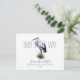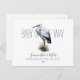 Um adorável anúncio de gravidez de cegonha dizendo que o bebê está a caminho, com tipografia balnear-blue cinza; para um simples anúncio branco neutro em relação ao gênero. Adicione seus nomes e data de vencimento.