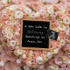 Um belo anúncio de gravidez pastel cor-de-rosa e branco com arranjo floral