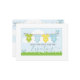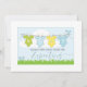 Uma ilustração de um anúncio de gravidez fofinha e caprichosa de uma linha de roupas com roupas de bebê. Adicione seus nomes e mensagens. A data de vencimento está listada no verso do anúncio com a ilustração da linha de clothesline. Primavera de corte como cores pastéis em azul, amarelo e verde. Sexo neutro.