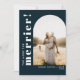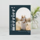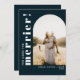 Um cartão de anúncio de gravidez de férias tipográfico divertido com sua foto de gravidez favorita em forma de arco e "quanto mais, melhor!" em fonte branca sobre um fundo azul-marinho. Você pode adicionar uma mensagem opcional no verso.