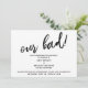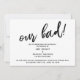 A distinção desta suíte se deve à moderna fonte de script manuscrito usada para frases de sotaque. Se você está na posição de precisar informar seus convidados de casamento que você teve que mudar seu grande encontro, aqui está uma opção humorística. Nesta peça, a fonte de script escrita à mão foi usada para criar um gráfico com a palavra "nosso ruim!", grande e ousado.Use os campos modelo para adicionar seus detalhes pessoais e tornar este design único e moderno seu próprio. O fundo branco pode ser alterado para qualquer cor que você preferir. Atenda a quaisquer solicitações especiais ou para personalizar a assistência. // 100 //