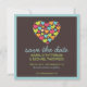 Um coração de corações em turquesa, lima, laranja e rosa quente faz um ótimo design divertido para um anúncio moderno de lembre-se da data.