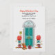 Uma porta frontal chata com plantadores topicários de ambos os lados e um ursinho de pelúcia e presente na frente. Seu número de endereço está no topo da porta. http://www.freepik.com/free-vector/sketchy-british-house-door_800124.htm.