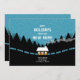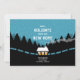 Mudança de tendência do anúncio de endereço em azul, com uma cabana confortável na floresta e uma floresta retrô com pinheiros e neve. Verifique a coleção de correspondência para COORDENAR ITENS. Angelilli Arte original de PUPSIKU STUDIO. Produtos exclusivos 100%.