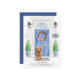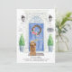 Anuncie seu novo discurso com nosso anúncio de na moda com um Ouro Honey Cockapoo, porta azul frontal, tapete de boas-vindas, tabuleiro, topiários e uma coroa floral em um fundo de tijolo de cinza.