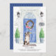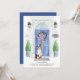 Anuncie seu novo discurso com nosso anúncio de na moda com um pastor australiano, porta azul, tapete de boas-vindas, tabuleiro, topiários e uma coroa floral em um fundo de tijolo de cinza.
