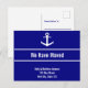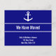 Este anúncio de mudança azul marinho e branco tem uma âncora de barco branca no topo. No meio, entre duas linhas, há um texto personalizável que atualmente diz 'Nós nos mudamos'. Personalize seu anúncio de mudança com seu nome e novo endereço em texto branco.