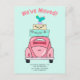 Anúncio de mudança com ilustração de mala cor pastel e carro, com veículo desenhado à mão de forma caprichosa, com cores rosa, turquesa e plantas de cacto.