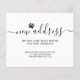 Este cartão de anúncio de mudança de cachorro econômico é decorado com tipografia de roteiro elegante e uma pata de cachorro.
