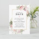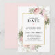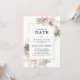 Rosas cor-de-rosa desbotadas e flores de hortênsia rusticamente decoram este modelo de evento adiado. As flores estão aninhadas em flores verdes de sage que decoram uma moldura dourada. A parte de trás do modelo de evento adiado é um rosa desbotado suave.