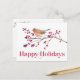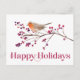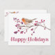 Feliz Feriados! Um passarinho alegre a tocar num galho adornado com bagas. Bela tipografia Adicione sua própria mensagem no lado do endereço para compartilhar sua própria saudação.