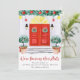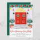 Anúncios elegantes de férias exibindo uma porta vermelha pintada, decorada com a água, flores de Natal, Enfeites de natal verdes, e arbustos de madeira de boxe pintados com bagas ocas. A frase "Estamos Decking New Halls" é exibida em um roteiro vermelho, escrito à mão, com seu novo endereço e nome abaixo.