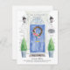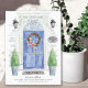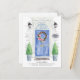 Anuncie seu novo endereço com nosso anúncio elegante com uma porta frontal azul, tapete de boas-vindas, placa de ardósia, topiárias e uma coroa floral sobre um fundo de tijolo cinza.