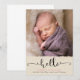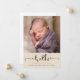 Este anúncio de nascimento simples, mas elegante apresenta a palavra "olá" numa tipografia moderna. A parte inferior da placa tem uma aparência de papel rasgada, enquanto a parte superior exibe sua nova foto de pacotes. Personalize com os detalhes de nascimento do bebê. Fotografia © Storytree Studios, Stanford, CA