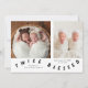 Cartão de nascimento branco com texto tipográfico que diz "duas vezes abençoado" no fundo com duas fotos na frente. Você pode adicionar uma terceira imagem no verso juntamente com as estatísticas de natalidade e a mensagem. O fundo é branco.
