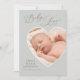 Este elegante e moderno anúncio de nascimento em foto vertical estilosa é um cartão frente e verso que apresenta uma foto em recorte em forma de coração do seu bebê recém-nascido menino ou menina e a doce frase "Amor de Bebê" em uma linda fonte manuscrita. Personalize este cartão de foto com sua mensagem personalizada da família (mãe, pai, irmãos se desejar) que pode ser personalizada no verso com qualquer mensagem ou citação de agradecimento dos novos pais. Há também uma segunda foto horizontal apresentada no verso. Tons de azul menta pastel suave, verde sálvia e cinza ardósia boêmio e desbotado.