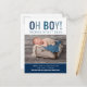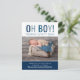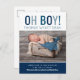Cartões-postais de anúncio de nascimento de bebê menino personalizados e impressos com suas fotos e texto. Este design moderno minimalista apresenta tipografia em negrito em tons de azul e azul-marinho com letras "Oh Boy!" e o nome do seu bebê, estatísticas de nascimento e foto abaixo. O verso tem um padrão de listras preppy ou você pode usar o espaço para fotos e texto adicionais. Use as ferramentas de design para editar as cores e fontes ou adicionar mais fotos para criar seus próprios cartões de anúncio de nascimento de menino exclusivos.