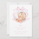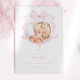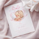 Esta placa de lançamento apresenta um design suave e elegante. A frente do cartão exibe uma foto de um bebê recém-nascido moldado por uma delicada fita rosa-aquarela em forma de arco. Com um esquema de cor rosa e branca, faz uma escolha perfeita para anunciar a chegada da sua menina.