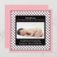 O texto e a foto do bebê nesta bebê bebê rosa, preta e branca, anunciando o nascimento de fotos da bolinhas, são totalmente personalizáveis. Para alterar o texto e a foto, use as opções personalizar. Para alterações mais abrangentes no anúncio, incluindo alterações na fonte, cor da fonte, tamanho da fonte, tamanho da foto e/ou posicionamento de texto/foto, use a opção personalizar. As cores neste anúncio de nascimento floral retrógrado são preto, branco e rosa-bebê. Ficaria excelente com uma foto de bebê branca e preta também.