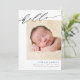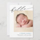 Compartilhe suas notícias alegres com este simples e moderno anúncio de nascimento. O cartão apresenta um roteiro bonito que lê "olá" no topo. Abaixo da caligrafia, adicione a foto do seu recém-nascido, o nome, as estatísticas de natalidade e os seus nomes. O nome do bebê está escrito em azul, mas isso pode ser facilmente alterado se você preferir outra cor. A cor de fundo na parte traseira do cartão é editável (mostrada como azul); você também pode adicionar fotos adicionais e uma mensagem personalizada na parte traseira, se desejar.