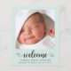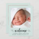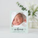 Um simples anúncio de nascimento verde, neutro em relação ao gênero, favorável ao orçamento. A frente apresenta a foto, o nome, a data de chegada e as estatísticas de natalidade do seu recém-nascido, e "bem-vindo" em um roteiro de na moda com batidas cardíacas. Ao contrário, adicione uma foto adicional, nomes de pais e irmãos e um obrigado personalizado que você ou outra mensagem.