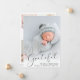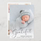 Um cartão moderno para anunciar o nascimento do seu bebê, com a sua foto sobreposta com "Grateful" escrito em um roteiro elegante com uma batida cardíaca. Por baixo, adicione o nome, a data de nascimento e o estado de nascimento. No verso, adicione três imagens adicionais e uma mensagem personalizada.