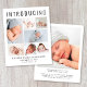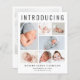 Um anúncio de nascimento elegante e econômico para apresentar seu bebê recém-nascido à família e amigos com "Apresentando" no topo em letras grandes, uma colagem de 7 fotos e seu nome, data de nascimento e estatísticas de natalidade em simples tipografia moderna. No verso, adicione outra foto e uma mensagem personalizada. Este papel semirbrilhante do orçamento é semelhante em peso ao papel fotográfico. Uma versão tradicional do estoque do cartão também está disponível (mensagem para o link).