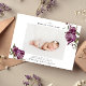Cartão de anúncio de nascimento russo com uma foto do seu recém-nascido mostrando a aquarela da flor de púrpura com verde.