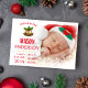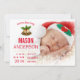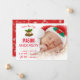 Cartão de nascimento de Natal com cobertura de tipografia vermelha na moda. Adicione todos os seus detalhes sobre este modelo fácil de usar e enfeite este cartão com a foto do seu bebê para torná-lo um anúncio de tipo único. Sacudir a placa para revelar um padrão elegante de flocos de neve vermelho e branco na parte traseira da placa.