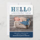 Barato de anúncios de nascimento de bebê impresso personalizados personalizados com suas fotos e texto. Esta design minimalista moderna apresenta uma tipografia ousada em tons de azul com a inscrição HELLO e o nome do seu bebê, estatísticas de natalidade e fotografia abaixo. O lado inverso tem um padrão de fita de pré-disquete ou use o espaço para fotos e texto adicionais. Use as ferramentas de design para editar as cores e as fontes ou adicionar mais fotos para criar seus próprios cartões de anúncio de nascimento de garoto exclusivos.