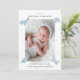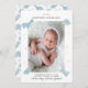 Cartão de anúncio de nascimento bonito com uma foto vertical do seu recém-nascido com ilustração de dinossauros azuis.