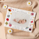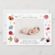Cartão de anúncio de nascimento bonito com uma foto do seu recém-nascido com ilustração de joias, flores e estrelas.