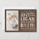 cartões com fotos de anúncio de nascimento de bebê impresso por barato. Este moderno design rústico apresenta um layout de tipografia tradicional personalizado com estatísticas de natalidade de bebês e fotos de recém-nascidos em um fundo de madeira falsa. Adicione mais fotos e texto adicional na parte traseira, se necessário. Use as ferramentas de design para editar as fontes de texto e as cores, adicionar mais fotos e criar um anúncio único de nascimento de um bebê para seu novo bebê.