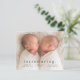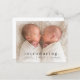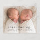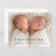 Um anúncio de nascimento de foto gêmea mínimo de orçamento com o tipo moderno e uma grande foto horizontal na frente. O verso tem 2 fotos com cabeçalho de nome grande e mensagem pessoal da família. Clique no botão editar para personalizar este design com suas fotos e detalhes.